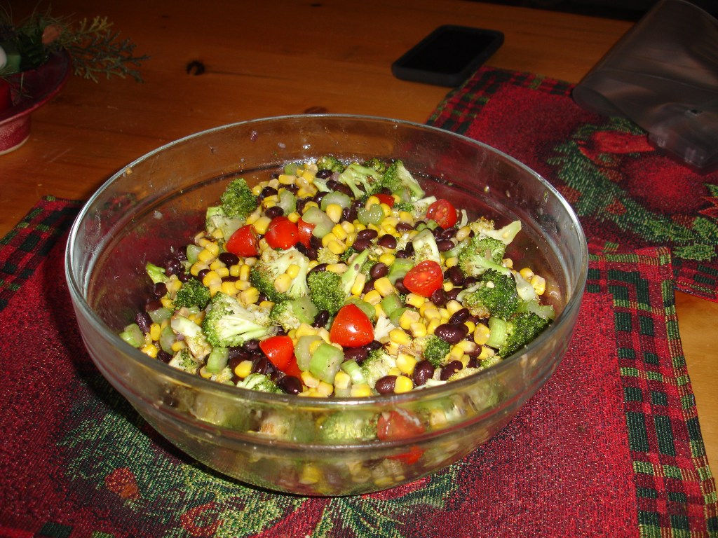 After eating all the sweets during the Christmas holidays, it is nice to get back to healthier food. This is Kathy Boitnott’s recipe that Charlie made today. Basically it is a vegetable salad that you can add your favorite vegetables. Also, you could vary the amounts of any vegetable. Here are the ingredients: