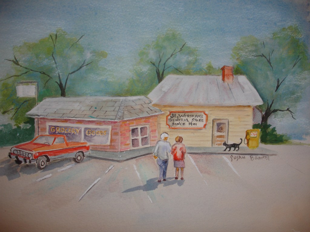 In 1889, Worsham’s Grocery Store opened. In 1952, a flood turned the building around and the store remained where nature placed it. The yellow structure was the original store and a brick structure was added later. The store was unique in that farmers were allowed credit until they were paid for their crops. In the 70’s the gentleman in the chair pumped gas for customers. Fire destroyed the store in 2008 and it was rebuilt with a modern building.
