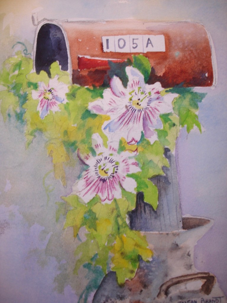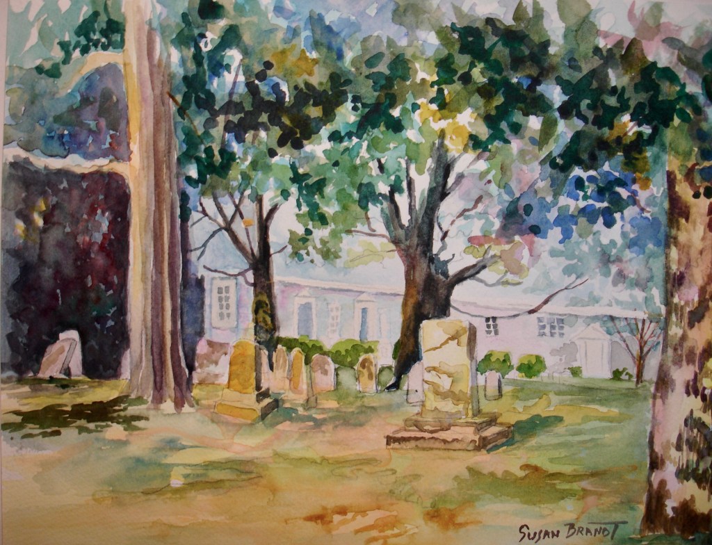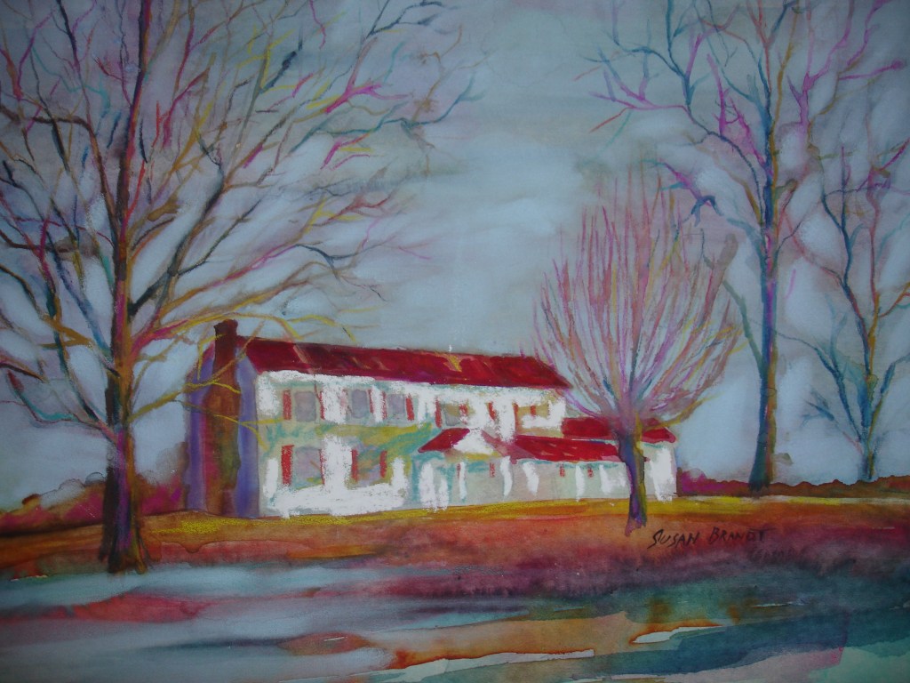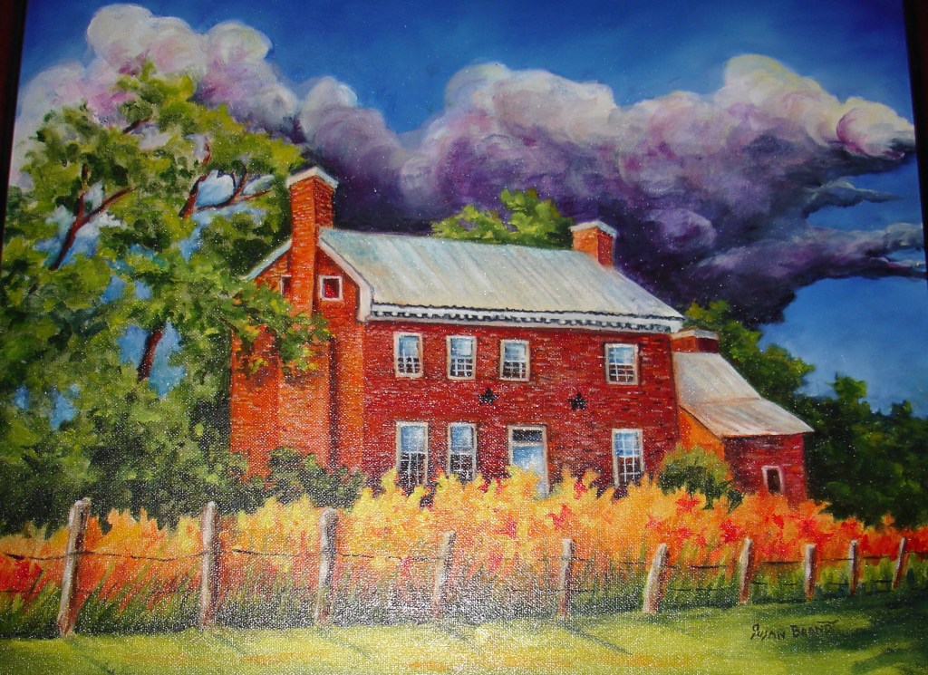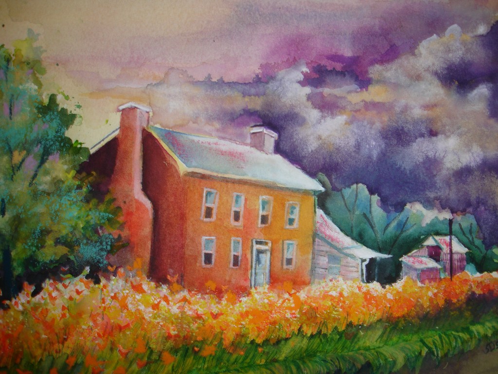 Many of the historic homes were built in the 1800s. I drove past “Old Brick” daily. One day as I drove past, a storm was coming in, but the sun lit up the day lilies in an spectacular way. I stopped and took a photo and painted that scene several times.
