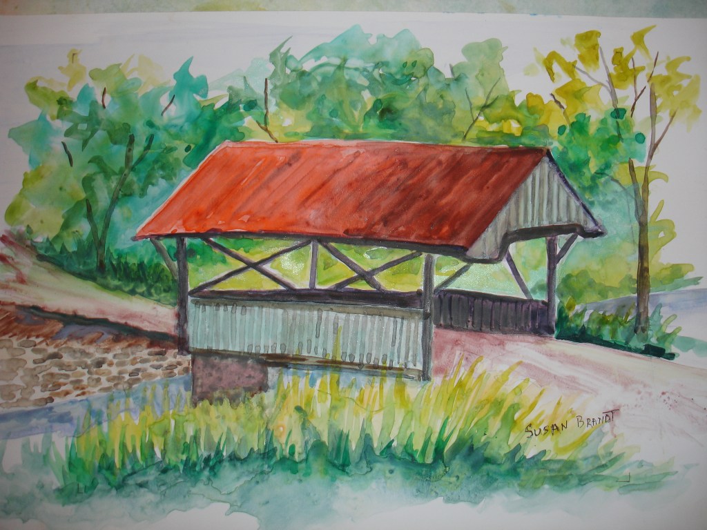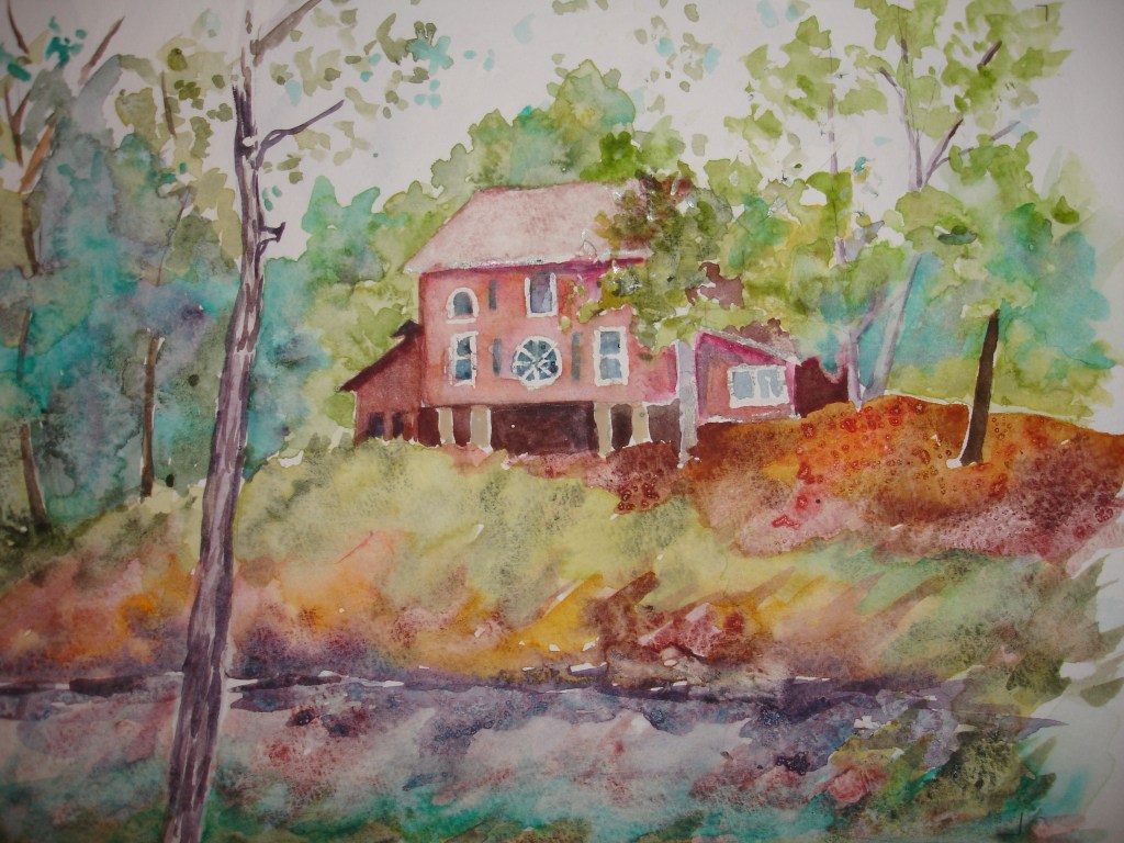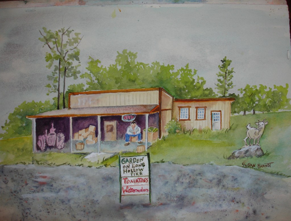 At the end of Tyree Springs Road and New Hope Road, a local builder ,Baxton Dickson, moved logs to a site on a hill and renovated it to a unique home. He also built a covered bridge to cross the creek. I traveled all over Tennessee scouting for grist mills to paint, and I was excited when someone told me that there was a grist mill in the Shackle Island area. I spent many days driving down dirt roads in the area looking for it. I finally asked Bobby Worsham if he knew where it was. He told me that it was on New Hope Road, close to his store. I had passed it everyday. The wheel was not on the structure so it looked like a barn. However, it had enough charm for me to paint it several times.