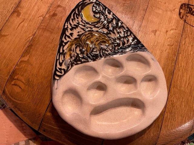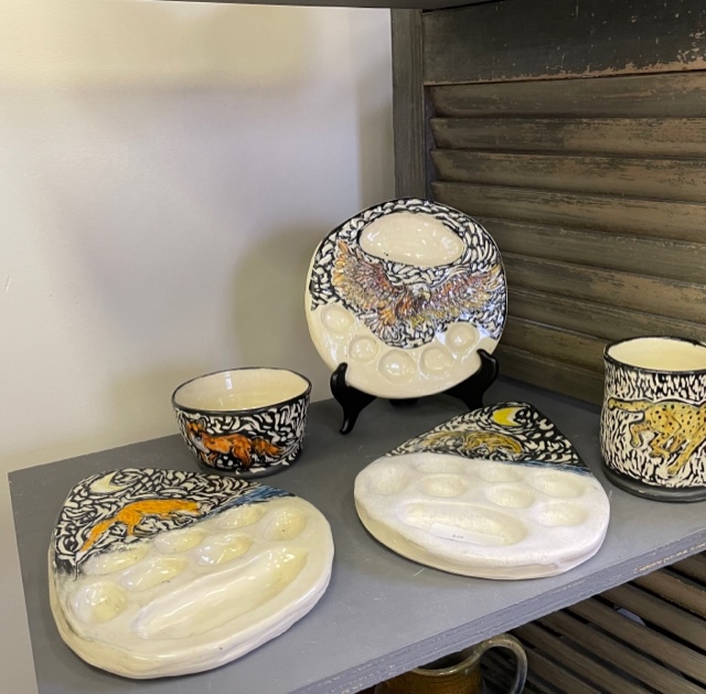 This new design in handcrafted dinnerware is now on display at my Ravin’ Studio space at the South Water Manor in Gallatin. Place settings can be preordered. All pieces are wheel thrown and hand painted. The set includes four sizes of plates and two sizes of bowls. The glaze is a deep green which has a bluish shimmer. Order directions and price (per place setting) can be viewed at my booth at the South Water Manor. You can also email me at susansstudio@att.net for a price per place setting.