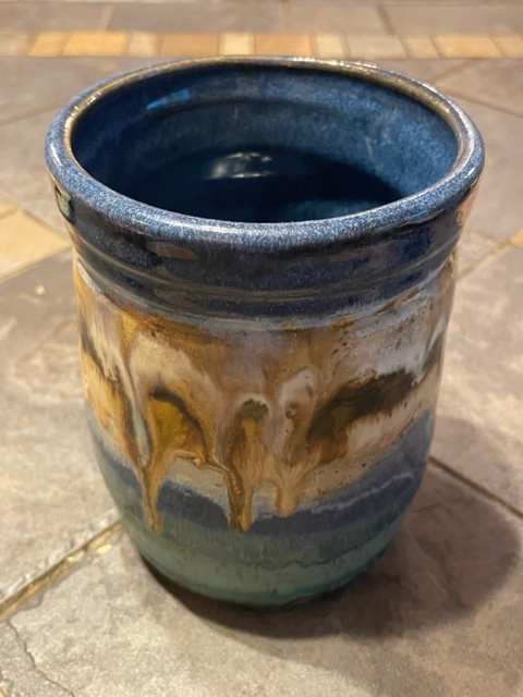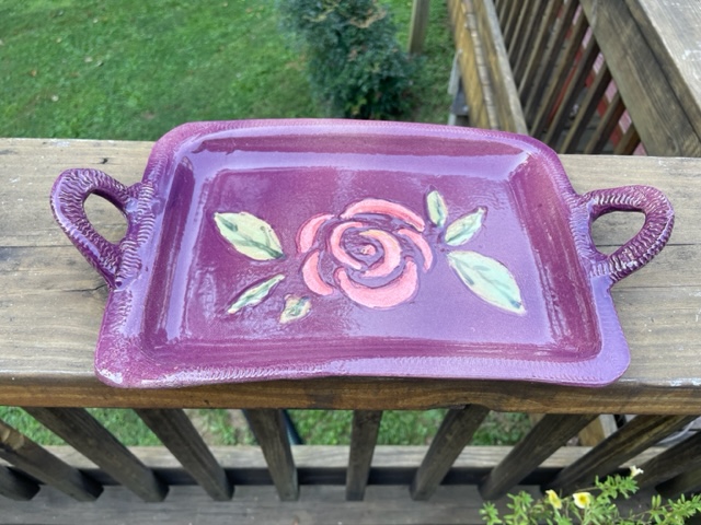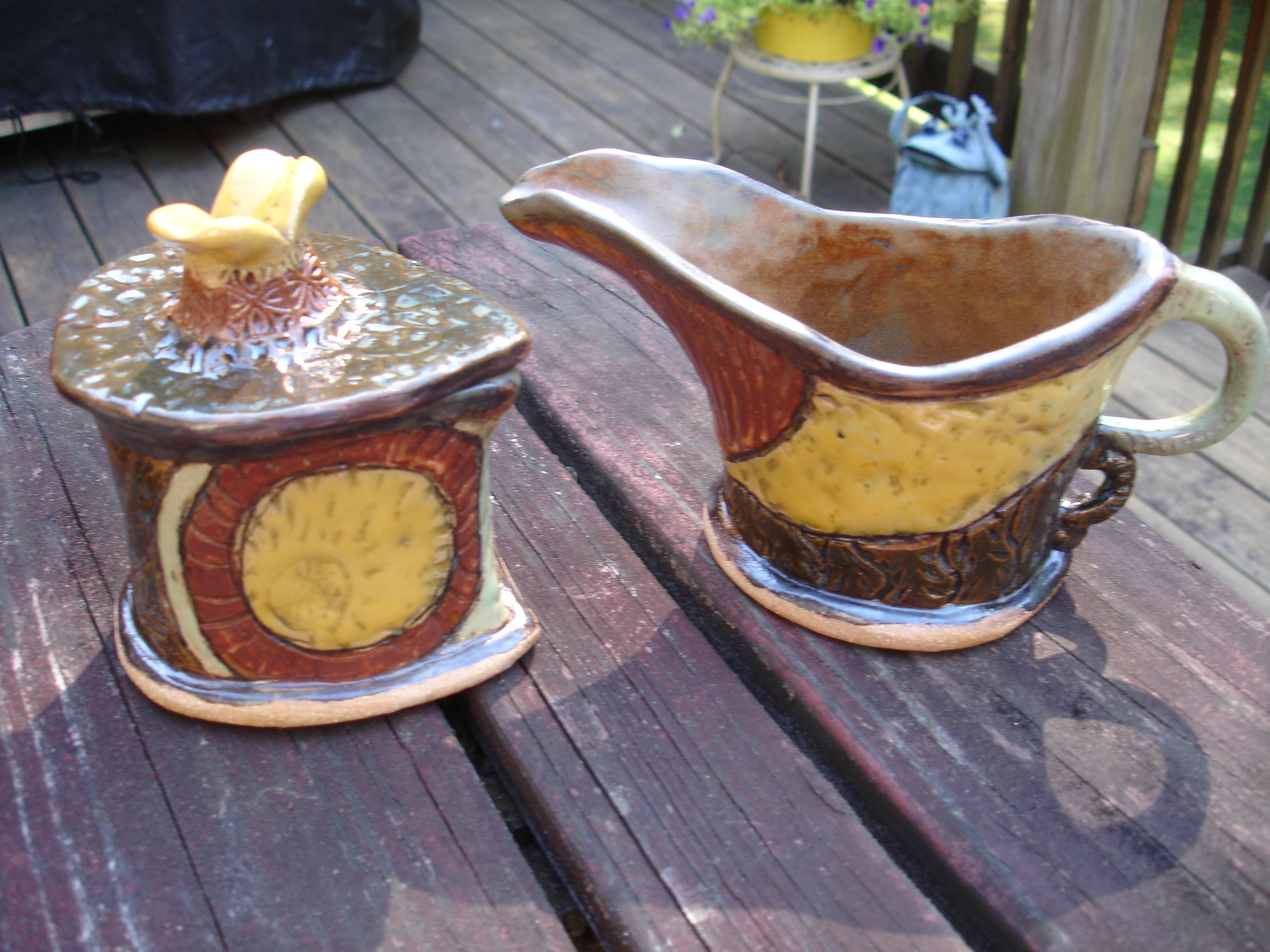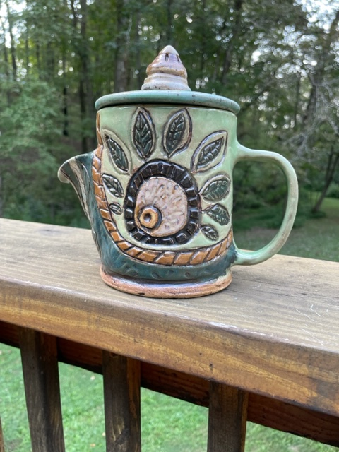 I’m experimenting with carving on clay before it is bone dry. The pattern evolves as I carve. I like to work in sets, so this group has a coffee pot, as well as a creamer and sugar bowl. The creamer and sugar bowl fit nicely on the tray. I would not make coffee in the pot, but brew it in my Mr. Coffee pot and serve it from the fancy pot
