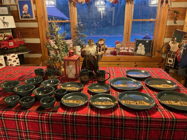 New Christmas pottery just delivered to South Water Manor in Gallatin. I have been busy making my first purchased dinnerware set of “The Mountains are Calling”. The last load is in the kiln now for the final firing .In between loads, I managed to crank out a few Christmas items. My favorite is the Silent Night mug. I used a glaze called Hydrangea and it looks like snow falling. I also finished a few watercolor paintings this month .My daughter asked for Charlie”s Lasagna recipe which is listed below.