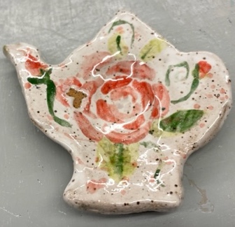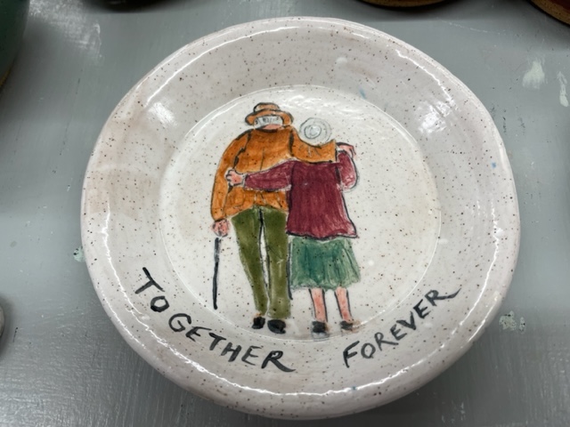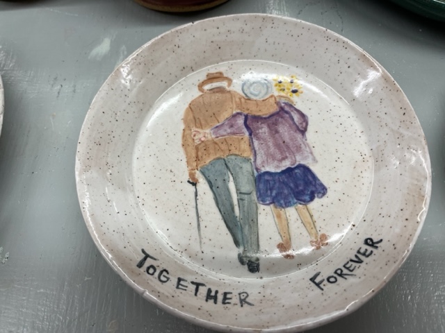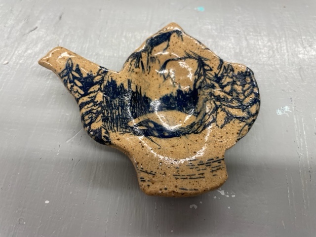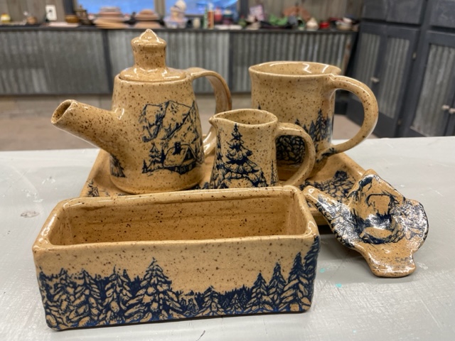 This is the latest load February 2024. The green mugs and bowls go to our personal dinnerware, that I have named “The mountains are calling.” I hand paint the middle mountains and creatively insert bears . The bowls have two bears ready for a fight. One of the mugs has a bear sleeping in a tree. Some of the items are now at South Water Manor in my Ravin Studio booth upstairs. I was working for rustic earthy color for the bacon cooker in the back. If you love bacon, I encourage you to buy one of my microwave bacon cookers. You drape about 6 slices of bacon over the edge of the cylinder, cover with a paper towel, and then heat in the microwave for 6 minutes. The real benefit comes from the easy clean up where you just pour the cooled grease in a can.