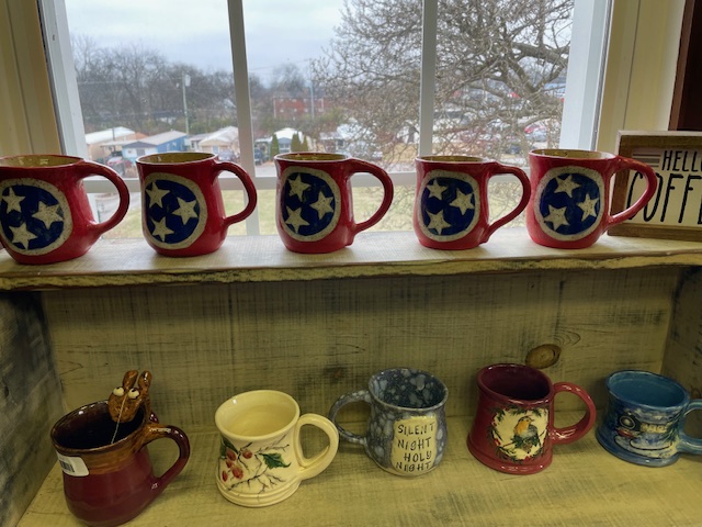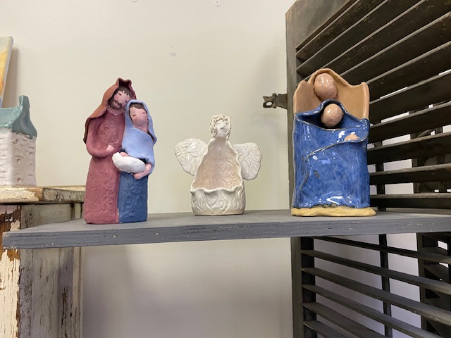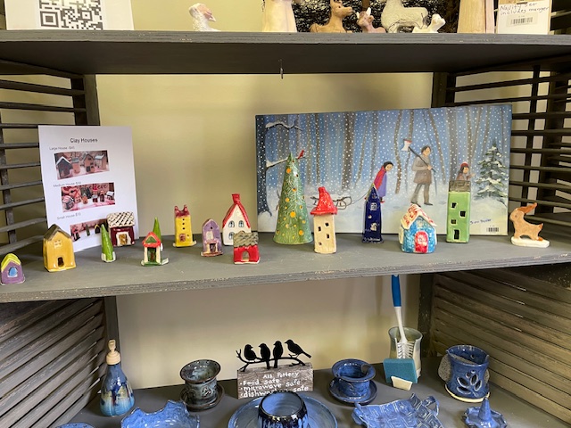 December 7,2024. This fall I sculpted more than working on the potter’s wheel due to a broken arm I enjoyed making miniature clay houses. I delivered the houses and two winter oil paintings to South Water Manor yesterday. These houses and paintings will be available for sale in my Ravin’ Studio Pottery booth upstairs through December 25th. .Thursday December 11th they will be open until 8:00. I encourage you to visit the South Water Manor to see the beautifully decorated mansion in the theme of ” It’s a Wonderful Life”. Also, you”re in for a treat with their breakfast and lunch menu. This will be my last month as a vendor, so I encourage you to purchase anything you might plan to go back for later. I have many functional pottery items that would make great gifts.,such as a microwave bacon cooker, an apple baker, a chip and dip bowl, a spoon holder and a yarn bowl. Also, I have five Tennessee Tristar coffee mugs, an item that goes quickly. I am going to post photos of the shelves in my pottery booth.