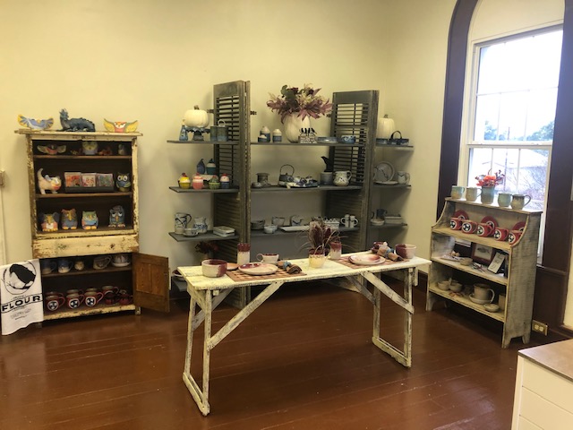 Thanks to my husband, daughters and son-in-laws. the booth finally came together . Julie, Rachael and I drove to Vinterist Artisan Shop in Chattanooga to get ideas for the display. Charlie and I scavenged antique shops looking for shutters and antique furniture. Tim and Dan built the shutter shelves. Julie and Rachael helped me plan the set up in my garage. Julie created the beautiful pumpkin floral design in the center of the top shelf. Rachael and Tim moved the bookcase, table and shutter shelves in, while my son-in-laws, Stacy and Jason hauled the heavy hutch with the owls up 2 flights of stairs. They didn’t even balk when I teased them about hauling it up the spiral staircase. Rachael helped me stage the pottery and didn’t hesitate to say “no” if she didn’t think my placement was right. Charlie helped with the final chore of hanging my Ravin Studio sign above the shutter shelves, which was a task putting the nails through the brick wall. So thank you again to my family for their moral support and physical help in making one of my art bucket list dreams become a reality.